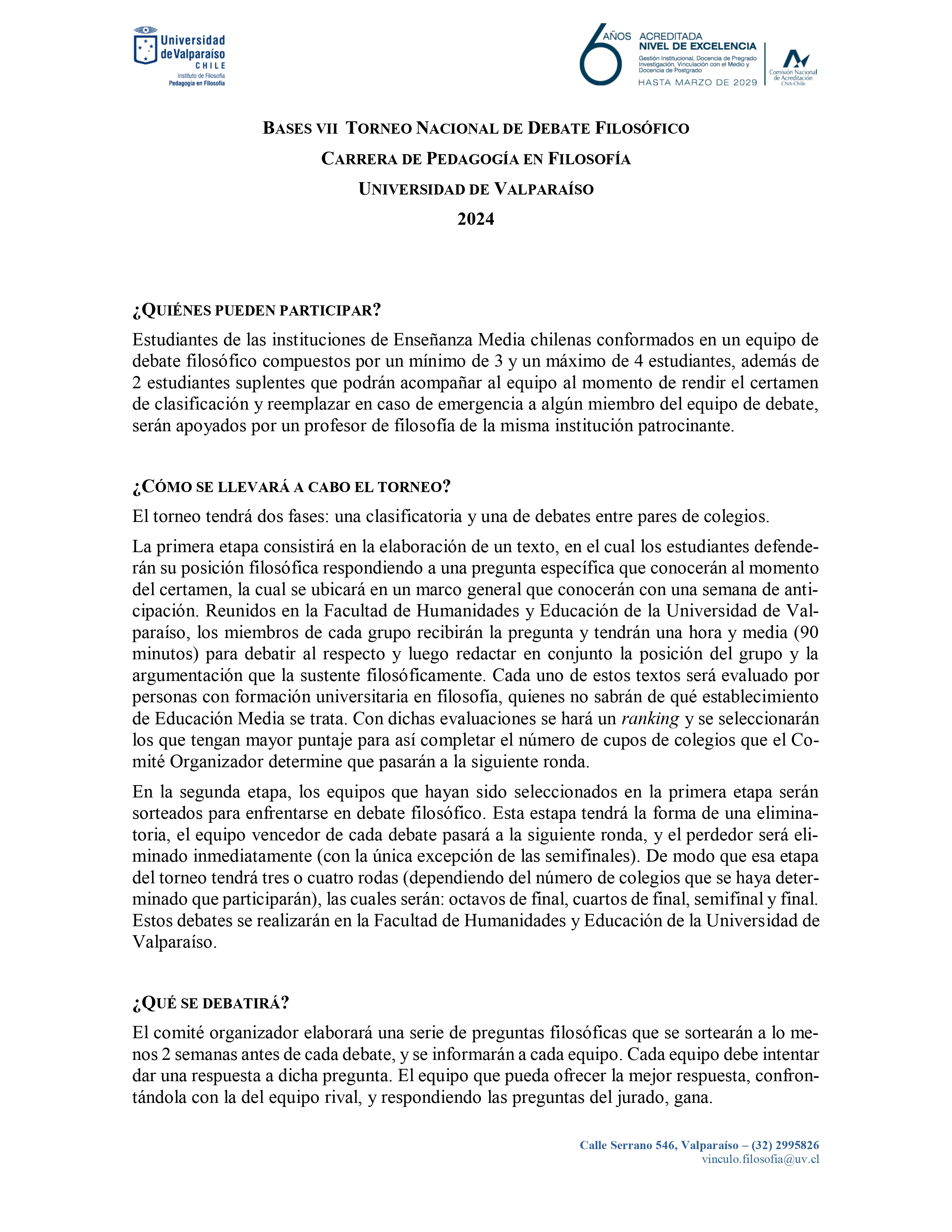 A nombre de la Carrera de Pedagogía en Filosofía del Instituto de Filosofía de la Universidad de Valparaíso les invitamos al VII Torneo de Debate Filosófico que promete ser una experiencia enriquecedora para todos los participantes.